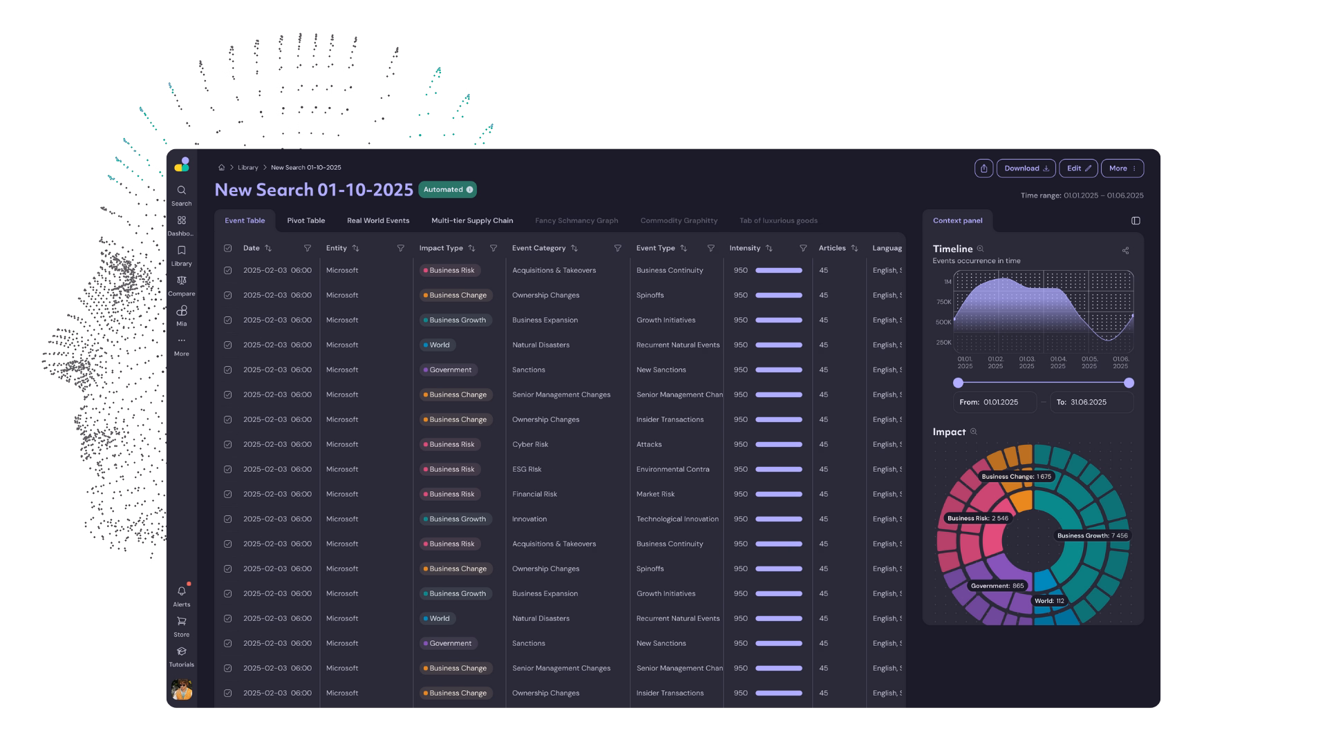 AI learns patterns in text, but it lacks structure. Semantic Visions builds entity-based and event-based knowledge graphs — connecting companies, suppliers, regions, and topics into a living network of relationships.